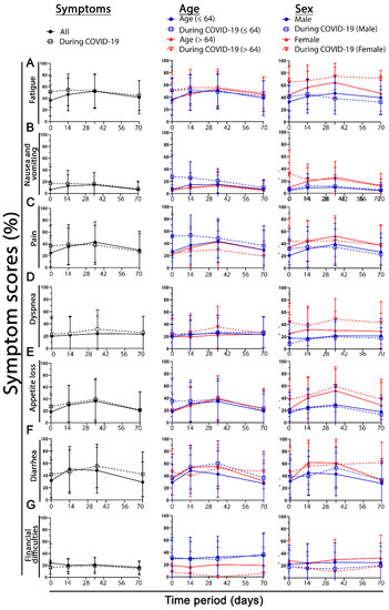 Time course of different symptom scores at day 1, day 14, day 35 and day 70. In the first column the entire cohort is separated into normal (before COVID-19) and during COVID-19. In the second column the cohort was divided into patients younger or 64 to older than 64. In the third column females and males of the cohort were compared for (A) fatigue, (B) nausea and vomiting, (C) pain, (D) dyspnea, (E) appetite loss, (F) diarrhea, and (G) financial difficulties at the different time periods at which the surveys took place, at day 1, day 14, day 35, and day 70. Error bars indicate the standard deviation.