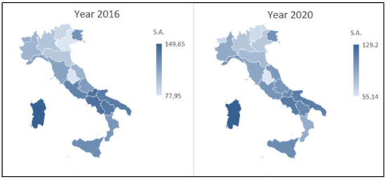 Cartogram of the Italian territory according to SA standardized rates (years 2016 and 2020).