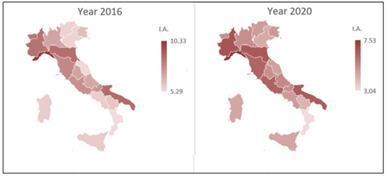 Cartogram of the Italian territory according to IA standardized rates (years 2016 and 2020).