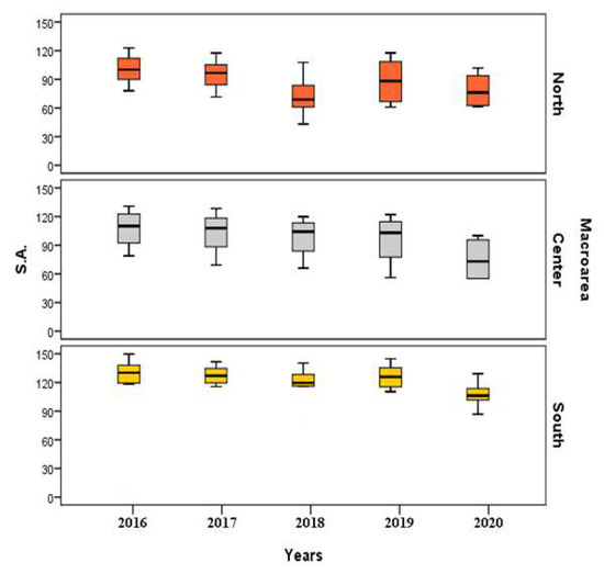 Figure 3 and Figure 4 show the boxplots of standardized rates of regional data, grouped for macro-areas (North, Center, and South) referring to SA and IA, respectively, for the period ranged between 2016 and 2020.