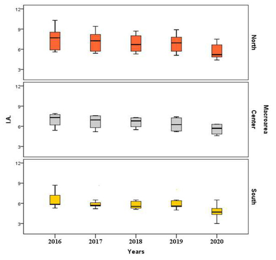 Regarding IA, there is an important decrease in the maximum and minimum values from the first to the last year of the examined period, with a different distribution of regional data.