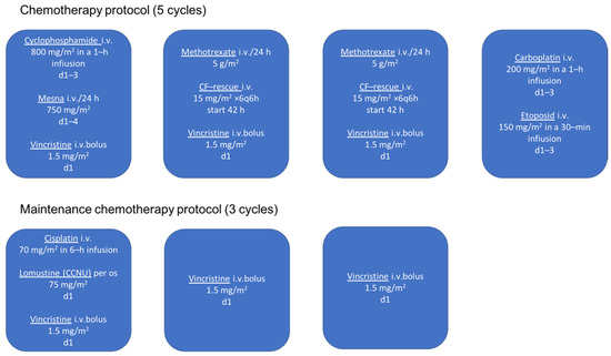 The medical history revealed that at the age of 4 months she was diagnosed with anaplastic ependymoma WHO grade III. Two weeks after total surgical removal of the tumor, chemotherapy protocol HIT2000 was initiated, consisting of four courses of five different drugs (cyclophosphamide, vincristine, methotrexate, etoposide, and carboplatin) administered in five cycles (Figure 1). The interval between the first day of each cycle was 21 days, and between each course 14 days. Drug doses are calculated taking into account the patient’s current body surface area. Considering the young age of the child, 2/3 of the full dose was applied up to 6 months, from 7–12 months of age 4/5 of the full dose, and after one year of age the full dose. More than 0.5 × 109 of granulocytes/L and more than 100 × 109 of platelets/L were mandatory homological criteria for the commencement of a new course. In the case of hematological toxicity, the patient received granulocyte colony-stimulating factor and blood transfusion (21 times). No other unacceptable toxicity occurred during chemotherapy. In the period of maintenance chemotherapy, the patient received three cycle courses of cisplatin, lomustine, and vincristine (Figure 1). After that, due to difficulties with the central venous catheter, the patient underwent treatment with temozolomide, administered in five cycles (first cycle 150 mg/m2, second cycle 200 mg/m2, third/fourth/fifth cycle 250 mg/m2), every four weeks 5 days. Due to the young age, radiotherapy was not applied.