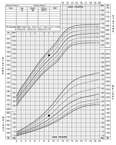 Patient stature and weight, 2 to 20 years: Girls stature-for-age and weight-for-age percentiles. Black marks indicate data of physical examination.