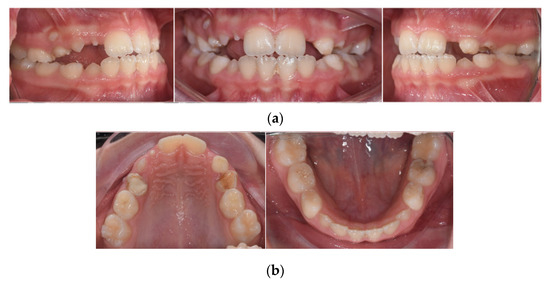 Intraoral clinical photographs, including views of: (a) anterior and posterior crossbite; (b) upper and lower arch.