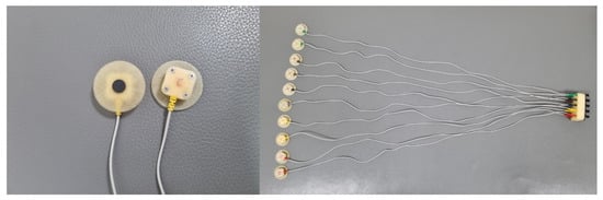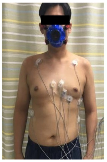 The participants were instructed not to consume food or caffeine drinks for 4 h prior to the test. They received a detailed explanation of the procedure and purpose of the test, including symptom and sign end points, and possible complications. We measured resting heart rate (HR) and blood pressure (BP) in the sitting position. A face mask for respiratory gas analysis was worn tightly to prevent air leakage. For underwater ECG monitoring, ten graphite electrodes were attached to the participants’ chest (Figure 1 and Figure 2) [1,19,21]. While the electrodes are not submerged in water, vigorous exercise can cause water to splash onto the electrodes. Therefore, we used waterproof electrodes to overcome the poor ECG signal quality associated with conventional electrodes when penetrated by water.