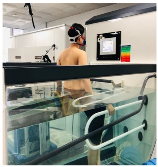 The participants entered the water tank and were immersed in water up to their umbilicus. The water and room temperatures were maintained at 28−29 °C and 25−26 °C, respectively. The face mask was connected to a respiratory gas analyzer (Quark CPET, COSMED, Rome, Italy). The graphite electrodes were connected to 12 channel ECGs for real-time CPET (CASE, GE healthcare, Chicago, IL, USA). The test was performed on Aquatrac-2000 (NARAMED, Gwangju, Korea) (Figure 3).