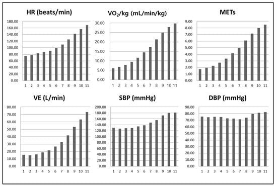 Figure 4 shows the cardiorespiratory responses during CPET using AT. HR, VO2/kg, METs, VE, and SBP values all showed an increasing trend with stage progression, while DBP showed no such trend.