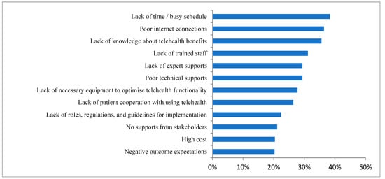 Our study found that lack of time/busy schedule, knowledge, and training programs were the most widespread barriers preventing HCPs from using telehealth. In clinical practice, it has been reported that the use of telehealth applications relies mainly on the level of knowledge and skills, and to what extent this option is available and easy to access within the healthcare organization [,]. In addition, technophobia, the fear of unknown technology, is a potential factor that could negatively impact the use of telehealth in some clinical staff [,,].
