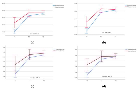Figure 1 illustrates the trends of the follow-up PADIS scores for the two groups. The mean score of PADIS and the subscales are listed in Table 2, according to which the overall trends increased during the three points in time. A comparison of the two groups revealed that the advanced nurses’ group scores were higher than those of the novice nurses in T1 and T2. However, the two groups presented a very similar trend in the T3 follow-up, as well as in knowledge, attitudes, and skills.