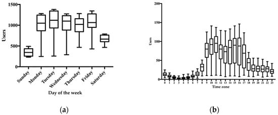 Day of week and time of day the SAGASU-DI was visited: (a) access counts of the SAGASU-DI relative to the day of week; (b) access counts of the SAGASU-DI relative to the time of day.