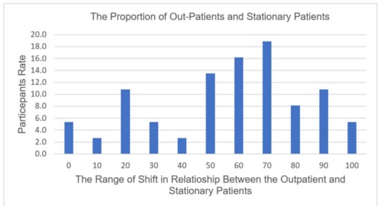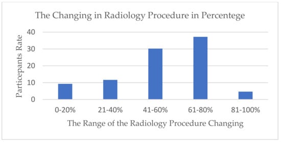 The type and number of radiographic procedures significantly changed during the pandemic; 67.7% of diagnostic radiographers agreed that the number of radiographic procedures changed due to COVID-19 (Figure 1). A total of 30.23% assumed that it had changed 41–60%, while 37.21% assumed that the change was around 61–80% (Figure 2). There is a significant positive relationship between COVID-19 and an increase in the number of outpatients in radiology departments (r (39) = 0.56, p = 0.001), which provides evidence of an increase in the workload in radiology departments during the COVID-19 crisis. A total of 67.4% of the respondents reported that there was a shift in the relationship between outpatients and stationary patients during the COVID-19 crisis (Figure 3). A total of 72.9% assumed that the proportion increased from 50% to 100%, while 5.4% assumed that there was no change in the proportion (Figure 4).