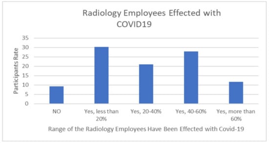 The results of this study show that COVID-19 had a remarkable impact on the diagnostic radiographers’ professional practice. The impact included changes in work hours, transfers to other clinics and areas, and patient overload due to infected employees in the departments. The majority of participants (76.7%) responded that they did not work for a short period of time during the COVID-19 pandemic, while 7.7% had their working hours reduced by more than 70% (Figure 5); around 55.8% had employees from their department transferred to other clinics or areas (Figure 6). Approximately 90% of departments contained colleagues infected with COVID-19 during the crisis compared to just 9.3% who did not have infected staff in their departments (Figure 7). This result agrees with many studies that present the changes in the work environment and X–ray procedures that occurred during the pandemic [7,10,12,18,19,20,21,22]. These studies confirm the effects of the pandemic on different levels, according to the magnitude of the pandemic and the availability of local resources [6,14,20,21,22,23]. Additionally, our results indicate that the patterns of work change during the pandemic. Some of the impacts of COVID-19 on the daily duties of individuals working in radiology departments was addressed by using technology that has never been used before. More than half (58.2%) of the surveyed departments used online tools for different purposes, while 41.9% did not. Online conferences were used in 27.9% of the radiology departments; 23.3% moved to online reporting; and 7% conducted radiology consultations online (Table 7). This result is in line with the other studies that investigated the changes in daily work patterns in both clinical and management aspects [11,24].