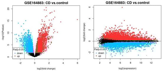 The differential gene expression between celiac disease and control cases. The gene expression of the groups of celiac disease and control samples were compared using GEO2R software. The up-regulated genes are highlighted in red, the down-regulated in blue, and the non–significant in black. Left, the volcano plot. Right, mean difference plot.