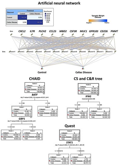 Machine learning and artificial neural network analysis for predicting celiac disease. This figure shows the results of the modeling of celiac disease using an artificial neural network, CHAID, C5, C & R, and Quest decision trees. The overall accuracy ranged from 96% to 100% using as predictors the gene expression (transcriptomic) data of the autoimmune discovery panel.