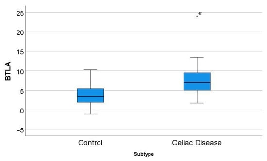 In the GSE164883, BTLA was identified as a relevant marker in several techniques, including gene set enrichment analysis (GSEA), logistic regression, random trees, and artificial neural networks. A direct comparison of the gene expression of BTLA between celiac disease and control was statistically significant: 7.8 ± 4.4 vs. 3.7 ± 2.8 (p < 0.001) (Figure 5).