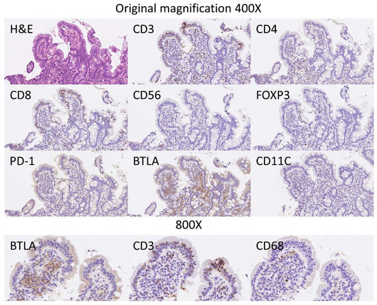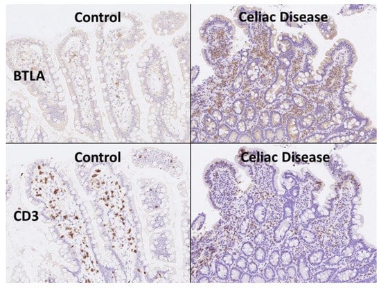 BTLA was analyzed at protein level by immunohistochemistry in an independent series of 16 celiac disease patients (with a total of 57 biopsies) and 16 small intestine controls (16 biopsies). The digital images of BTLA are uploaded to zenodo platform as a zip file (https://doi.org/10.5281/zenodo.6837120, accessed on 13 July 2022) (see Supplementary Materials). In the celiac disease cases, four biopsies were excluded from the analysis as BTLA expression was completely absent (0% of positive cells in the inflammatory infiltrate of the lamina propria) without the presence of internal controls.