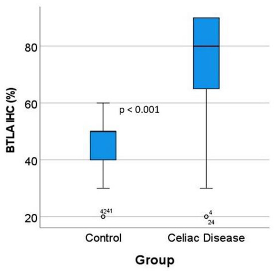 BTLA protein expression by immunohistochemistry in the validation series. After BTLA immunohistochemistry and quantification, celiac disease cases were characterized by high BTLA protein expression (p < 0.001). The outliers are marked with a circle, next to the icon there is a number that corresponds to the case number.