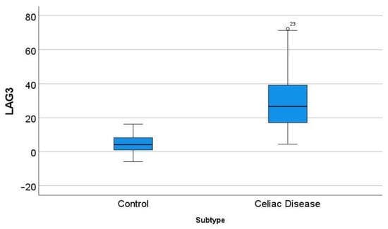In the GSE164883, LAG3 was identified as a relevant marker in several techniques, including gene set enrichment analysis (GSEA), random forest, and artificial neural networks. A direct comparison of the gene expression of LAG3 between celiac disease and control was statistically significant: 30.7 ± 17.9 vs. 4.6 ± 4.9 (p < 0.001) (Figure 9).