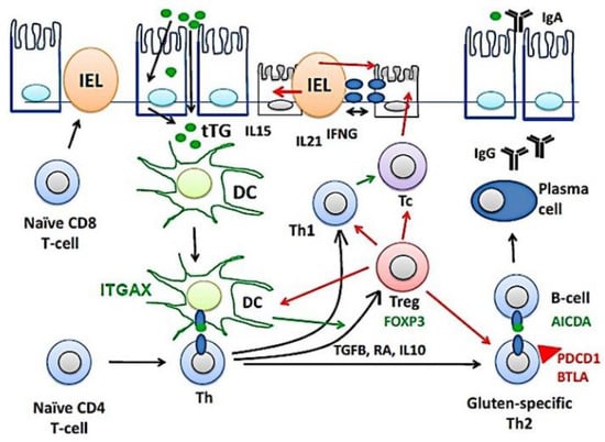 - Mazzarella, G. Effector and suppressor T cells in celiac disease. World J. Gastroenterol. 2015, 21, 7349–7356. [Google Scholar] [CrossRef]