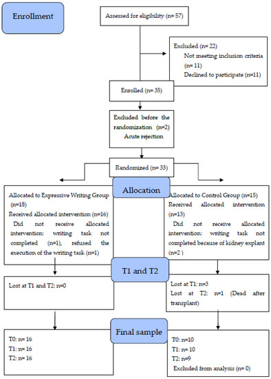 Out of the 57 patients contacted, 35 were recruited initially, of which 2 had an acute rejection before the randomization, and 9 others dropped out, leaving a final sample of 26. The sample size was based on an a priori power analysis, which considered the effect reported in a previous study on similar outcomes, such us depression [17], with a significance level of α = 0.05, β = 0.02 and power (1-β) = 80%. This suggested a sample size of 10 participants (5 per group), therefore the number of participants tested in the present study can be considered adequate. The participants were blindly randomly assigned to one of the two groups by an independent researcher. All participants were randomized into two groups; the random allocation of the participants was performed in a double-blind manner, the reference researcher generated the random allocation sequence, asking the participants to extract from a box a closed sheet, in which the kind of group was specified. The sheets were filled by a clinician and placed in the box. Neither the researcher nor the participant knew a priori the contents of the extracted sheets. Participants were not informed about the treatment tasks. The size of the randomization block was established as reaching 5 consecutive extractions with the same group; at which point, the group was eliminated from the box, and the extraction continued with only one sheet. The two groups were the expressive writing group (EWG) and the control group (CG).