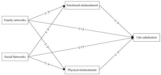 Previous studies have shown that the physical and emotional mistreatment of elders have a significant negative impact on life satisfaction. However, few studies have focused on the potential ways to alleviate elder physical and emotional mistreatment. In China, under the influence of Confucian culture, family relationships are regarded as an important part of intimate relationships, and the extension of family networks may have a potential role in alleviating elder physical and emotional mistreatment. In addition to this, older adults living in the same area for a long time have fixed social networks, and social networks may have significant intervention effects on elder physical and emotional mistreatment. Therefore, in this paper, we discuss the effects of family and social networks on the life satisfaction of older adults in mitigating their mistreatment in the Chinese social context through a large, nationally representative sample. As a result, the following three sets of hypotheses are proposed. In addition, we have drawn a conceptual framework based on the hypotheses (see Figure 1).