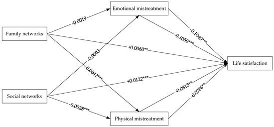 Based on the above analysis, the results presented in Figure 2 are those of the path analysis. In Figure 2, both family networks and social networks had no significant effect on emotional mistreatment, both had a significant effect on physical mistreatment, and both enhanced life satisfaction by mitigating physical mistreatment.