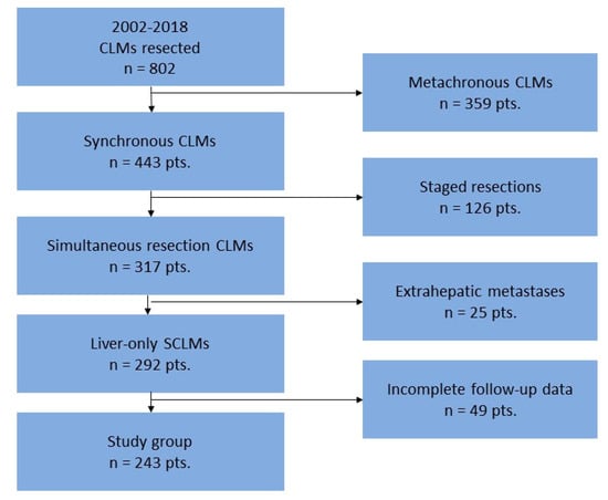 We conducted a single-institution survival cohort study in patients with SR, collecting clinical, pathological, and postoperative complication data. All consecutive adult patients who underwent SR between January 2002 and December 2018 were retrieved from a prospectively maintained database including all the patients who underwent resection of CLMs in our center. Patients with extrahepatic metastases, as well as those with incomplete follow-up data, were excluded from this analysis. The flow-chart diagram of the included patients is presented in Figure 1.