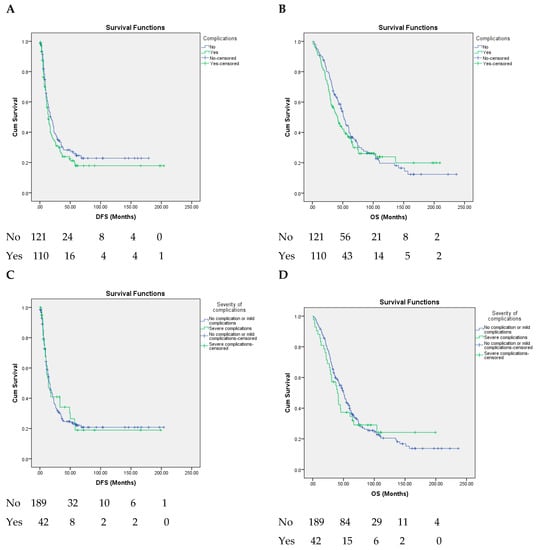 The presence of postoperative complications, their grade or type, and CCI had no significant impact on either DFS or OS (p value > 0.05) (Figure 2, Table 3 and Table 4).