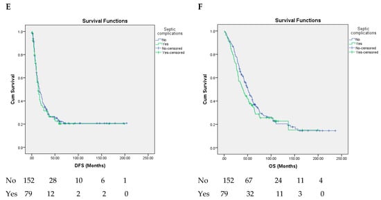 Kaplan–Meier curve of with SCLMs resected comparing (A) disease-free survival for complications vs. no complications, p = 0.245; (B) overall survival for complications vs. no complications, p = 0.488; (C) disease-free survival for patients without complications or with mild complications vs. severe complications, p = 0.907; (D) overall survival for patients without complications or with mild complications vs. severe complications, p = 0.727; (E) disease-free survival for septic complications vs. no septic complications, p = 0.661; (F) overall survival for septic complications vs. no septic complications, p = 0.391.
