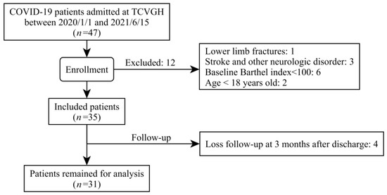 This single-centered, retrospective cohort study was approved by the Institutional Review Board of Taichung Veterans General Hospital. Consents from the patients were exempted due to the approval (CE21317A#1). The protocol was prespecified in advance and registered in the ClinicalTrials.gov (Identifier: NCT05195736). Hospitalized patients based on the initial diagnosis of COVID-19 between 1 January 2020 and 15 June 2021 were included in our study. These patients all registered a positive COVID-19 polymerase chain reaction test, pneumonia appearance on a chest X-ray, and prominent clinical symptoms related to COVID-19, thus fulfilling the criteria for hospitalization. Patients were excluded if they were less than 18 years old or had any medical history that impeded performing basic activities during daily life, such as fractures, stroke, or other neurodegenerative diseases. The Barthel index was used to check the basic activities of daily life of these patients [19]. Those with a baseline Barthel index score less than 100 before the onset of COVID-19 were excluded from our study.