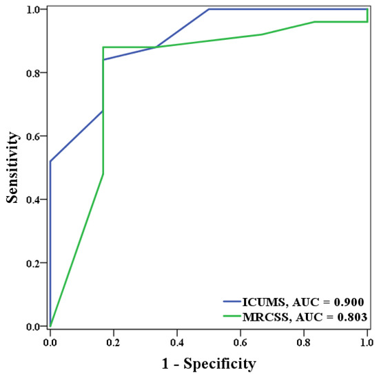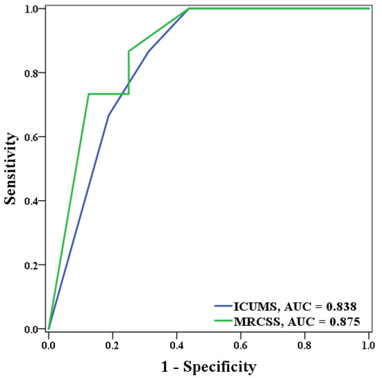 The ROC curve of ICUMS and MRCSS in predicting those with a Barthel index score of less than 100 at three months after discharge.