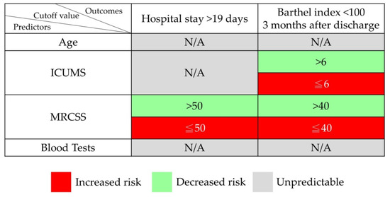 The ROC curve analysis was performed on ICUMS and MRCSS for the Barthel index scores three months after discharge and for the days of hospitalization. For identifying patients with a Barthel index score of less than 100 at three months after discharge, the ICUMS presented an AUC of 0.9, while the MRCSS presented an AUC of 0.803 (Figure 2). As for the length of hospital stay, the ICUMS presented an AUC of 0.838, and the MRCSS presented an AUC of 0.875 in identifying patients with hospitalization longer than 19 days (Figure 3). The cutoff points in predicting both outcomes are shown in Table 6. For ICUMS, the cutoff points for both Barthel index scores three months after discharge and the days of hospitalization was 6, which means the COVID-19 patients might be hospitalized for more than 19 days or have a Barthel index < 100 three months after discharge if their initial ICUMS score was less than six. On the other hand, for MRCSS, it was 40 and 50, respectively. It indicates that patients might not be totally independent three months after discharge if their initial MRCSS scored less than 40 and might be hospitalized for more than 19 days if their initial MRCSS scored less than 50. The results of the predictive ability and cutoff points are summarized in Figure 4.