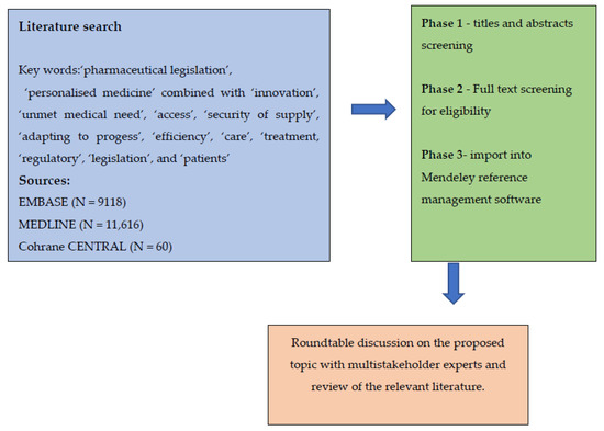 Inputs presented in this paper are based on a systematic literature search undertaken to develop an overview to contextualise challenges and opportunities related to the plan for revised pharmaceutical legislation. This was complemented by a multistakeholder expert workshop organised by the EAPM earlier in 2022. A narrative literature search was performed in EMBASE (via Ovid), MEDLINE (via PubMed), and Cochrane CENTRAL. Records identified through the designed search strategy were imported into Mendeley reference management software. Search terms were based on terminology used by EAPM and the authors’ own experiences in the field and focused on: ‘pharmaceutical legislation’ and ‘personalised medicine’ combined with ‘innovation’, ‘unmet medical need’, ‘access’, ‘security of supply’, ‘adapting to progress’, ‘efficiency’, ‘care’, ‘treatment, ‘regulatory’, ‘legislation’, and ‘patients’ (Figure 1). Only articles written in English, published after 2005, and full texts were included in the review. Panel members were drawn from key stakeholders whose interaction created a cross-sectoral, relevant, and dynamic discussion forum. These participants included public health decision makers, representatives from the European Commission, Members of the Parliament, patient organisations, and umbrella organisations representing interest groups and associations engaged in the field. Experts discussed all topics (innovation, unmet medical need, access, security of supply, adapting to progress, and efficiency) together but were also allocated to groups based on their individual expertise. The meeting discussed the literature findings from the perspective of different stakeholders and identified potential pitfalls and advantages in the current Commission proposals. The expected outcome of the expert panel was to feed into activity that will support policy engagement at the EU level and national level related to fostering innovation, including in areas of UMN, ensuring access to affordable medicines, improving security of supply, adapting to new scientific and technological developments, and reducing red tape.