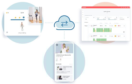 Schematic representation of the intervention. The top-left figure depicts a patient performing a session with motion trackers placed on the body transmitting the sensor data to the cloud. The top-right figure shows the web-based portal with the data of a patient’s sessions which can be assessed by the PT, who can adjust the program as needed. The bottom-center figure shows examples of educational articles on the dedicated smartphone app educating patients about their condition and pain self-management.