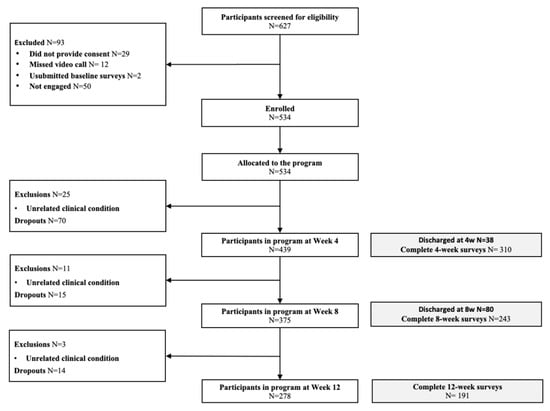 From 617 screened participants, 29 did not provide consent, 12 missed the video call, 2 did not submit the baseline survey, and 50 did not start (Figure 2). In total, 534 subjects started the program, and 396 completed the intervention (74.2% completion rate). No serious adverse events [] were reported during the study. On average, participants were middle-aged (mean 50.2, SD 11.3), overweight (mean BMI 29.1, SD 6.4), and the majority were females (68.0%) (Table 1). No differences were found between completers (N = 396) and non-completers (N = 138) other than younger age (p = 0.002) and higher baseline levels of depressive symptoms (p = 0.009) in non-completers (Supplementary Table S1).