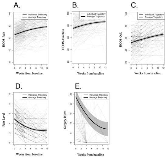 Longitudinal trajectories across time. Primary Outcomes: (A) HOOS-Pain; (B) HOOS-Function; (C) HOOS-QoL; (D) Pain Level; (E) Surgery Intent. Lighter lines represent individual trajectories (with darker lines indicating overlap of trajectories), while average trajectories calculated through LGCA are depicted in bold lines, with shadows representing 95% confidence intervals.