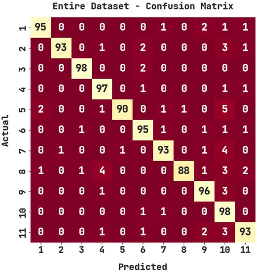 The confusion matrix generated by the ASODCAE-SLR model on the entire dataset is demonstrated in Figure 3. The figure depicted that the ASODCAE-SLR model has accurately recognized all the 11 class labels on the entire dataset.