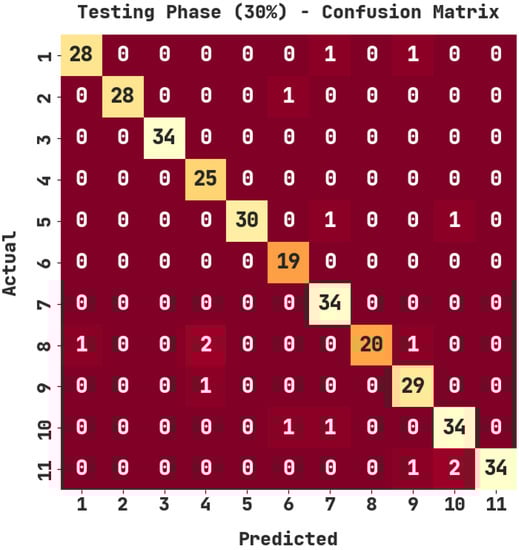 The confusion matrix generated by the ASODCAE-SLR approach on 30% of testing (TS) data is represented in Figure 5. The figure depicted that the ASODCAE-SLR technique has accurately recognized all the 11 class labels on 30% of the TS dataset.