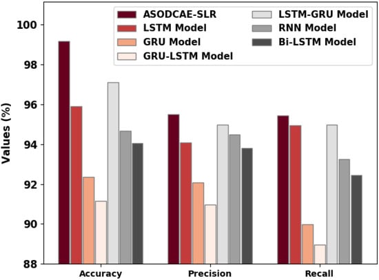 Next, the GRU, RNN, and BiLSTM models have reported slightly enhanced classification performance whereas the LSTM model has shown reasonable classification performance. Moreover, the LSTM-GRU model has accomplished near-optimal performance. However, the obtained values implied that the ASODCAE-SLR model has accomplished improved performance over other models.