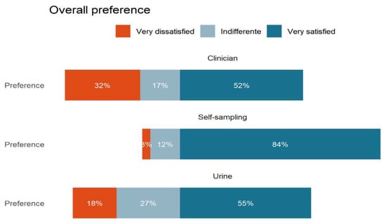 - Shin, H.Y.; Lee, B.; Hwang, S.-H.; Lee, D.O.; Sung, N.Y.; Park, J.Y.; Jun, J.K. Evaluation of satisfaction with three different cervical cancer screening modalities: Clinician-collected Pap test vs. HPV test by self-sampling vs. HPV test by urine sampling. J. Gynecol. Oncol. 2019, 30, e76. [Google Scholar] [CrossRef] [PubMed]