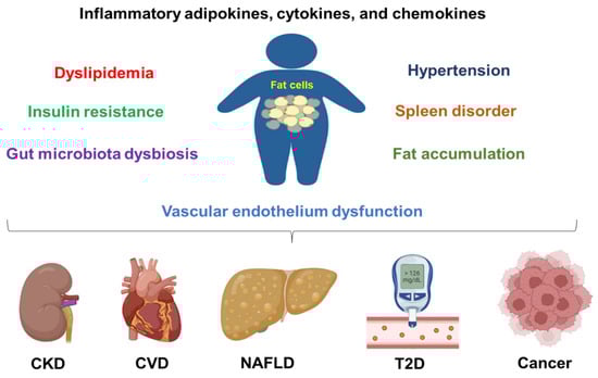 Obesity contributes to chronic disease development and progression. Obesity can cause inflammation, dyslipidemia, insulin resistance, hypertension, fat accumulation, vascular endothelium dysfunction, spleen disorder, and gut microbiota dysbiosis. All these conditions are contributing factors to chronic kidney disease (CKD), cardiovascular diseases (CVDs), non-alcoholic fatty liver disease (NAFLD), type 2 diabetes (T2D), and cancers.