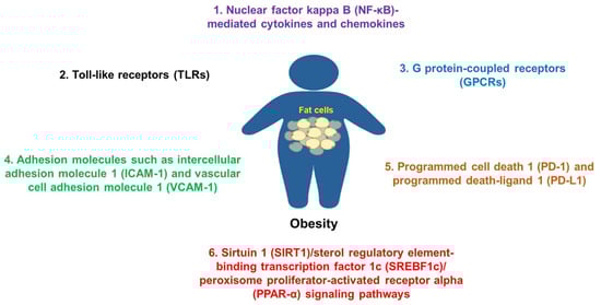 Some common molecules and their signaling pathways in the pathogenesis of obesity. Molecules such as NF-κB, TLRs, adhesion molecules, GPCRs, PD-1/PD-L1, SIRT1, and others are commonly involved in the pathogenesis of obesity.