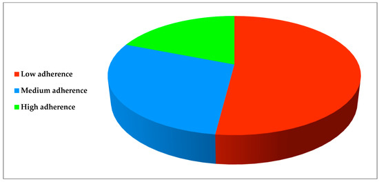 The overall level of adherence resulted as low in 270 (51.82%) subjects, medium in 153 (29.37%), and high in 98 (18.81%), respectively (Figure 2).