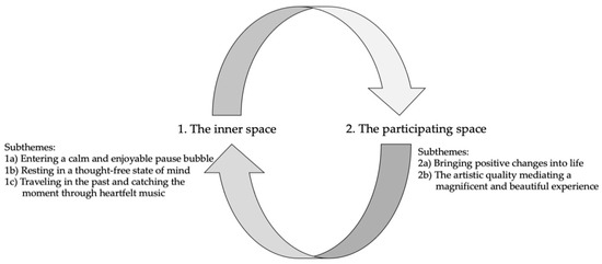 We identified two main themes: (1) the inner space and (2) the participating space, followed by five subthemes among the patients, nurses, and musicians: (1a) entering a calm and enjoyable pause bubble; (1b) resting in a thought-free state of mind; (1c) traveling in the past and catching the moment through heartfelt music; (2a) bringing positive changes into life; and (2b) the artistic quality mediating a magnificent and beautiful experience (Figure 1).