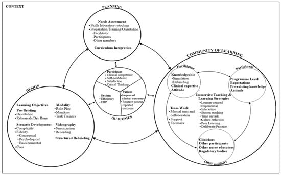 Section 3.4 presents the final proposed framework informed by findings of the narrative synthesis of the scoping review and situational analysis. The final SBCNE framework consists of four broad components: planning, design, community of learning, and outcomes, which exist within the context. The bi-directional arrows linking the four main components of the framework denotes the reciprocal influence of the components on each other. The outcomes are greatly influenced by the degree of effective attainment of each of the other broad components. Thus, the level of attainment of the outcomes could possibly suggest a manipulation of the other components to maximise the benefits of the simulation experience. The components of the framework, as illustrated in Figure 2, are described below.