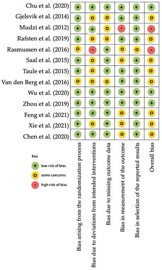Risk of bias assessment according to the Cochrane Collaboration’s tool (RoB 2.0) for randomised controlled trials.