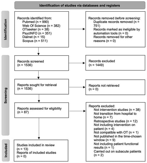 A systematic search was carried out to search for available evidence related to the study topic and the PRISMA statement was followed [37]. Only studies published in the last 10 years from 1 January 2011 to 31 December 2021 and published in Spanish and English were selected. The type of study design accepted was RCT, only including those that investigated the benefits of interventions within the scope of OT for adults in the process of post-stroke hospital-to-home discharge. The studies had to carry out the intervention in the patient’s transition to home and evaluate the improvements in the functional ability of the person with stroke. Therefore, studies that carried out interventions for patients who were discharged to rehabilitation units or nursing homes were excluded.