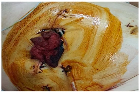 Postoperatively, the patient was extubated and admitted to the intensive care unit for monitoring; the NovoSeven® administration continued with the same doses at every 2 h. After 10 h, the patient developed the clinical picture of hypovolemia (pallor, hypotension, tachycardia); palpation revealed increased abdominal tenderness, the drainage was about 500 mL of hematic fluid, and the hemoglobin level decreased from 14 g/dL to 6 g/dL; the abdominal ultrasound was performed in emergency and confirmed the presence of intraperitoneal fluid. We decided upon emergency surgical reintervention due to hemodynamic instability; 500 mL of intraperitoneal blood was evacuated, and a diffuse hemorrhage from the subhepatic region and from the dissection of the inflammatory process was also observed, with no major source of active bleeding. A perihepatic packing was performed (Figure 2).
