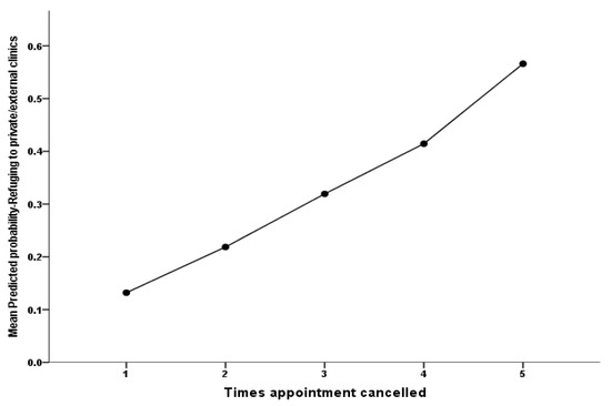 Additionally, the resulting multivariate analysis findings showed that the patients who experienced the mean number of appointment cancellations correlated significantly and positively with their odds of using external medical services: as the patients’ number of canceled appointments rises by one cancellation, on average, their odds of resorting to external clinical services tends to rise by a factor equal to 1.79 times higher on average, p = 0.012. Figure 1 clearly demonstrates that as the patients’ number of canceled appointments (on the x-axis) rises, their adjusted probability of referring to external clinics tends to rise incrementally on the y-axis accordingly. In addition, the analysis model demonstrated that the patients who faced difficulty obtaining their lubricant drop top-ups were found to be 4.62 times more likely to use external medical services compared with those who did not face difficulties obtaining their lubricant drop top-ups, p = 0.002.