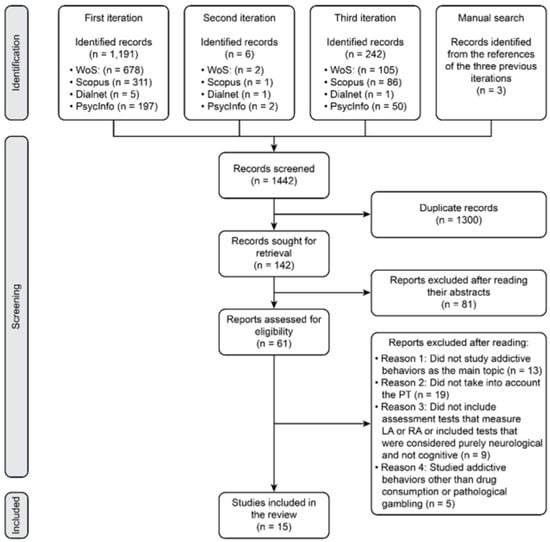 The eligibility of 61 papers was assessed after reading the abstracts of the 142 works that were previously selected. Some of the 61 articles were excluded after their body text was read in its entirety. The reasons for their rejection were not studying addictive behaviors as the main topic (n = 13), not take PT into account (n = 19), not including assessment tests that measure LA or RA, using tests that were considered purely neurological and not cognitive (n = 9) and studying addictive behaviors other than drug consumption or pathological gambling (n = 5). Finally, the review started with a total of 15 articles that fit the criteria (see Figure 1).